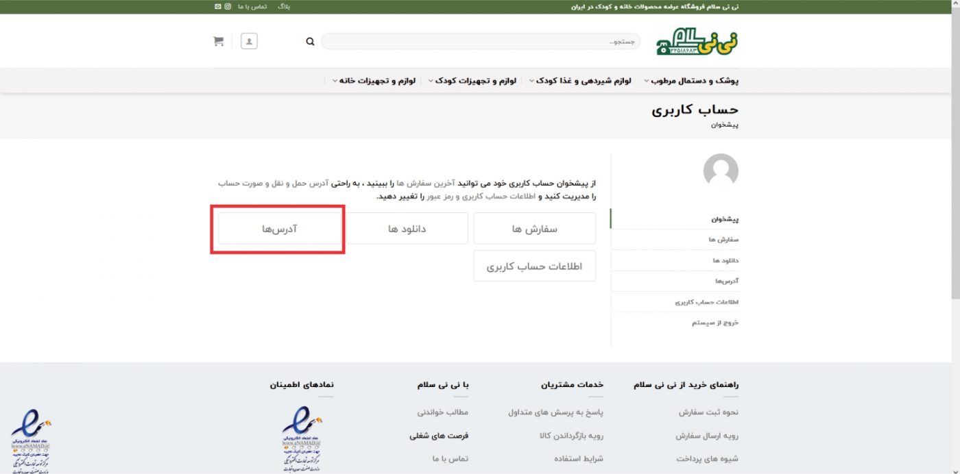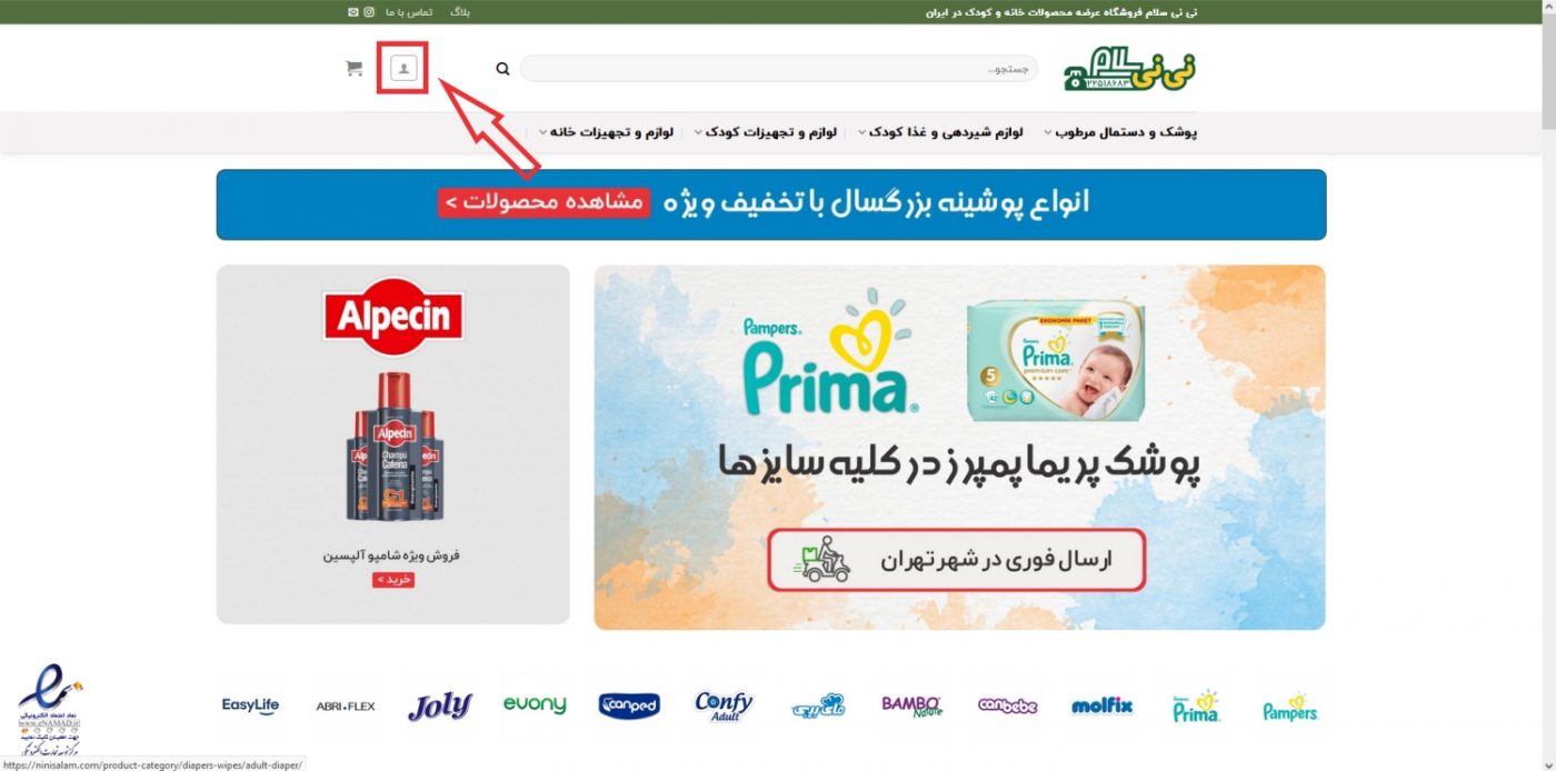 - در صفحه اصلی فروشگاه نی نی سلام در قسمت آیکون حساب کاربری کلیک کنید.