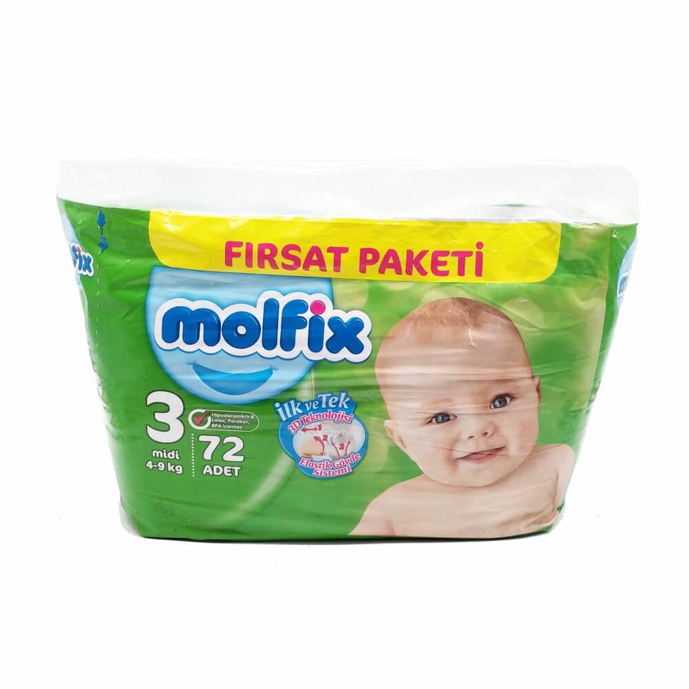 پوشک مولفیکس ترکیه در سایزهای ۰ تا ۶ برای کودکان از بدو تولد تا بالای ۱۵ کیلوگرم در فروشگاه بزرگ نی نی سلام قابل دسترس می باشد. پوشک مولفیکس سایز ۳ در بسته های ۷۲ عددی برای کودکان ۴ تا ۹ کیلوگرم مناسب است. پوشک مولفیکس ترکیه مانع از سوختگی پای کودک می شود و در لبه های پوشک لایه نازک و نرمی تعبیه شده است که حساسیت های معمول که در اغلب پوشک ها برای کودک حادث می شود را در پی نخواهد داشت. پوشک مولفیکس ترکیه بسیار انعطاف پذیر بوده و کاملا با فرم بدن کودک همسان است و مانع از اذیت شدن کودک می شود. لایه خارجی این پوشک دارای سیستم گردش هوا بوده و درون پوشک نیز کودک با وجود بافت مناسبِ طراحی شده هرگز دچارعرق سوختگی و ادرار سوختگی نمی گردد.